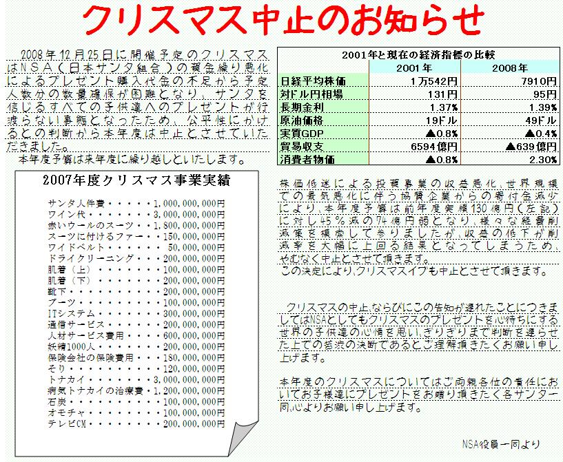 今年は、日本サンタ組合の資金繰りが深刻化、2008年のクリスマスは中止に